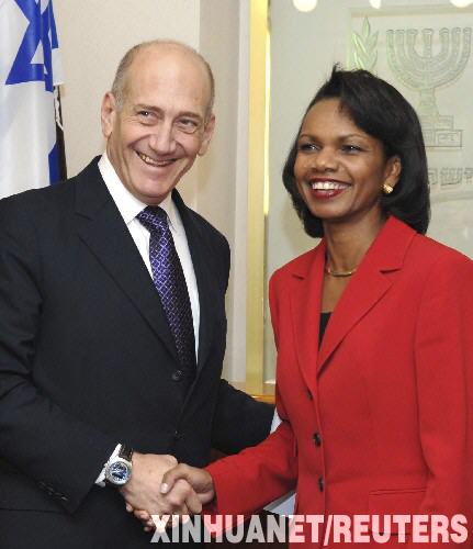 10月14日,以色列總理奧爾默特(左)在耶路撒冷會見到訪的美國國務卿賴斯。賴斯當日上午在抵達以色列開始新一輪中東外交斡旋時說,她此行旨在為11月召開的中東問題國際會議做準備,敦促以色列和巴勒斯坦政府在草擬聯合聲明的過程中盡量減少隔閡。但她預計這次外交斡旋成果將有限。 新華社/路透