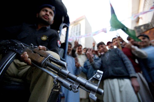 2月18日,在巴基斯坦拉瓦爾品第市的一個投票站外,安全人員正在警戒。巴基斯坦議會選舉投票當地時間18日17時(北京時間20時)正式結束,各投票站工作人員開始計票工作。 新華社記者才揚攝