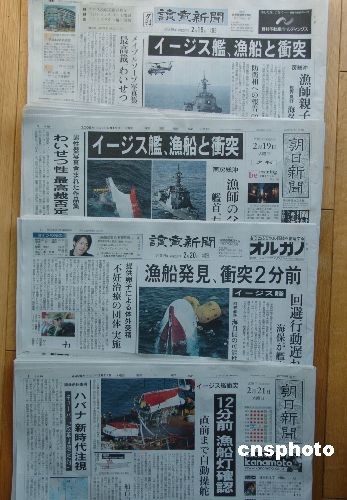 圖為19日至21日的合計(jì)發(fā)行量近2000萬份的《讀賣新聞》和《朝日新聞》的頭版頭條報(bào)道。2月19日發(fā)生的日本宙斯盾軍艦撞沉漁船的事故在日本政界引發(fā)了軒然大波,在野黨紛紛質(zhì)疑擁有“世界上最先進(jìn)的雷達(dá)系統(tǒng)”的軍艦為何突然不靈了,而首相福田則可能因此再次遭受新的打擊。 中新社發(fā) 段躍中 攝