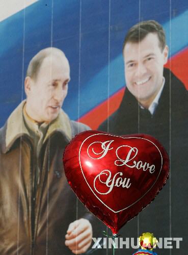 3月1日,在俄羅斯首都莫斯科市中心,一只氣球飛過俄總統(tǒng)候選人梅德韋杰夫的競選宣傳畫。3月2日,俄羅斯將舉行總統(tǒng)選舉投票。 新華社記者沈伯韓攝