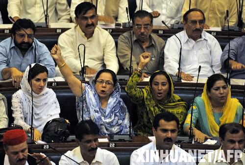 8月13日,巴基斯坦信德省的議員們在首府卡拉奇參加一次議會會議時高呼反對總統穆沙拉夫的口號。信德省議會當日通過一項議案,要求總統穆沙拉夫尋求信任投票。這是繼旁遮普省議會、西北邊境省議會之后第三個通過類似議案的省議會。 圖片來源:新華社/法新
