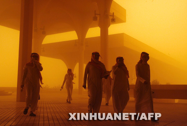 3月10日,在沙特阿拉伯首都利雅得,人們頂著沙塵暴艱難而行。當日,利雅得遭遇沙塵暴天氣,到處都是滾滾黃塵。新華社/法新