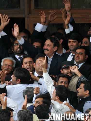 3月16日,在巴基斯坦伊斯蘭堡,喬杜里(中、留胡子未系領帶者)和律師們參加慶祝活動。巴基斯坦總理吉拉尼16日發表電視講話,宣布恢復喬杜里巴基斯坦最高法院首席大法官的職務。喬杜里在2007年11月巴前總統穆沙拉夫實行緊急狀態時被解職。 新華社記者饒博攝