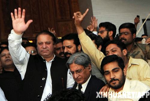 3月16日,巴基斯坦前總理、穆斯林聯盟(謝里夫派)領導人謝里夫(左)在東部旁遮普省的古杰蘭瓦拉市參加集會活動。謝里夫在當日的集會上說,鑒于政府已同意恢復被解職的最高法院首席大法官喬杜里的職務,他宣布停止其領導的游行抗議活動。 新華社/法新