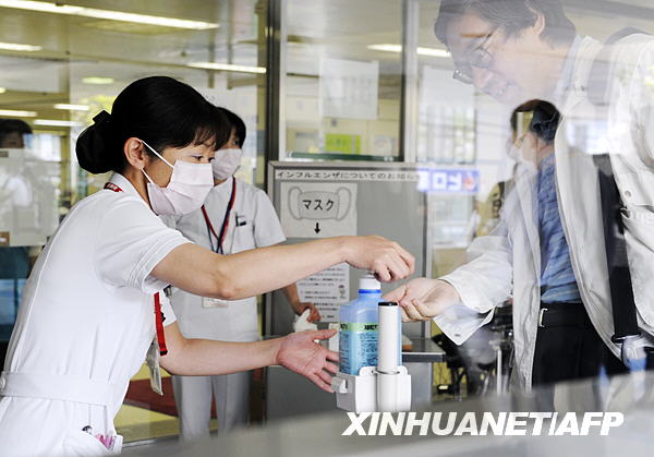 5月1日,在日本橫濱市立市民醫院,一名醫護人員為進入醫院的患者戴口罩。日本橫濱市政府1日說,當地一名高中男生出現A(H1N1)型流感類似癥狀,這是日本發現的首個A(H1N1)型流感疑似病例。目前這名高中生正在市民醫院接受治療。新華社/法新