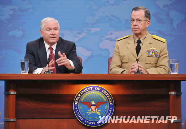 5月11日,美國國防部長蓋茨(左)和美國參謀長聯(lián)席會議主席邁克爾·馬倫在首都華盛頓五角大樓出席新聞發(fā)布會。當(dāng)日,蓋茨在新聞發(fā)布會上宣布,他已要求駐阿富汗美軍指揮官麥基爾南上將辭職,并推薦前美軍特種作戰(zhàn)司令部司令麥克里斯特爾中將接任。新華社/法新