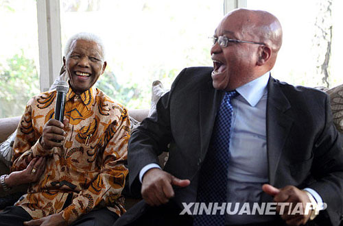 7月18日,南非總統祖馬(右)在約翰內斯堡祝賀前總統納爾遜·曼德拉(左)91歲生日。當天,曼德拉在約翰內斯堡的家中慶祝他91歲生日。新華社/法新