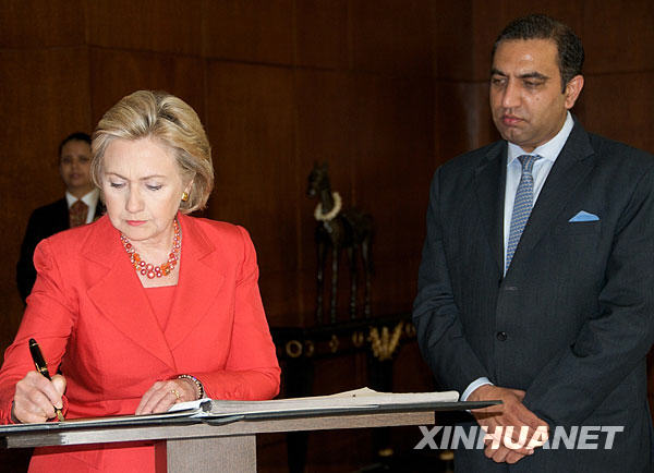 7月18日,在印度孟買的泰姬瑪哈酒店,到訪的美國國務(wù)卿希拉里·克林頓(前左)在留言簿上簽名。希拉里于17日晚到達(dá)孟買,開始對(duì)印度的數(shù)天正式訪問。這是希拉里就任美國國務(wù)卿以來對(duì)印度的首次訪問。新華社發(fā)
