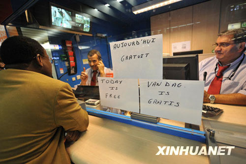 9月20日,在比利時(shí)首都布魯塞爾,地鐵售票窗口在“無(wú)車日”打出免費(fèi)乘坐的標(biāo)志。當(dāng)天是布魯塞爾一年一度的“無(wú)車日”,政府鼓勵(lì)市民騎自行車或乘坐公共交通工具出行,樹立綠色城市交通的環(huán)保理念。新華社記者武巍攝