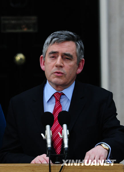 5月11日,在英國(guó)倫敦,英國(guó)首相布朗在唐寧街10號(hào)首相官邸外宣布辭職。 新華社記者 曾毅 攝