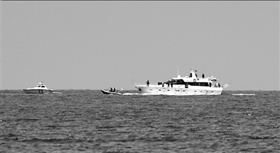 一艘救援船只(右)被押往阿什杜德港口。新華社發