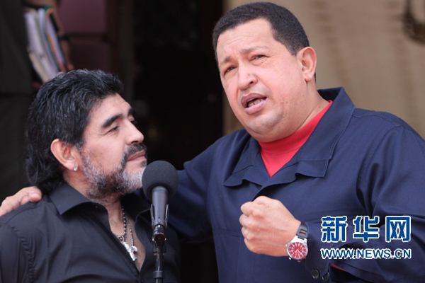 7月22日,在委內瑞拉首都加拉加斯總統府,委內瑞拉總統查韋斯(右)與阿根廷國家足球隊主教練馬拉多納會面。新華社發