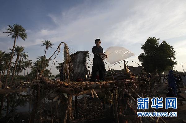 8月18日,在巴基斯坦信德省蘇庫爾,一名兒童在路邊一處棚屋頂上避災時玩一個塑料袋。聯合國警告說,巴基斯坦洪災區可能會有大約350萬兒童面臨通過被污染的水或昆蟲感染疾病的危險。7月下旬以來,巴基斯坦部分地區遭遇特大洪澇災害。巴基斯坦政府官員8月16日表示,洪災已造成1600多人喪生,2000多萬人受災,部分洪澇災區已暴發疫情。新華社/路透