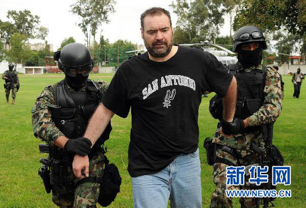 2010年9月13日,墨西哥一毒梟落網(wǎng)。 9月12日,在墨西哥普埃布拉市郊,墨西哥海軍陸戰(zhàn)隊(duì)士兵押送被捕的毒梟塞爾希奧·比利亞雷亞爾·巴拉甘。(新華社發(fā),鮑菲菲攝)