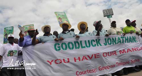 尼總統喬納森的支持者在阿布賈雄鷹廣場參加競選集會。殷淼攝