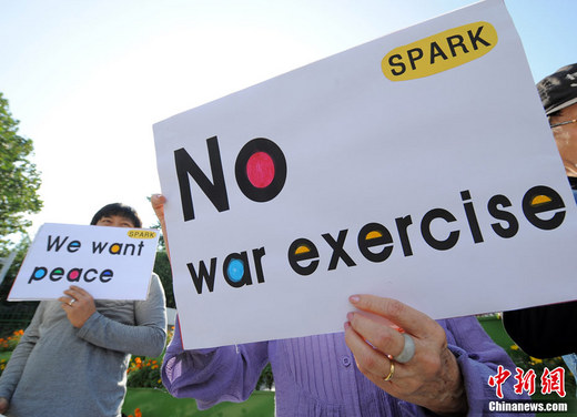 韓美反潛聯合軍事演習27日在韓國西部海域(黃海)拉開帷幕。當日,一些韓國反戰人士在國防部門前集會抗議美韓聯合軍演。