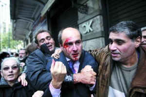 當地時間15日,雅典,希臘前發展部長被抗議者打傷。