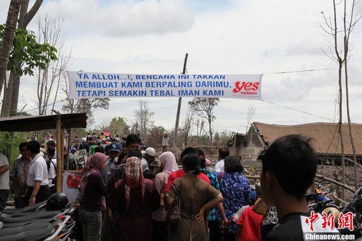 記者19日驅(qū)車抵達(dá)上月初受默拉皮火山噴發(fā)巖漿影響最嚴(yán)重的GUNGAN村時(shí),只見沿途車水馬龍、游人如織。當(dāng)?shù)卮迕裆碇y(tǒng)一的服裝,或指揮交通、或手拿寫著“募捐”字樣的紙箱向游客兜攬捐款。隨行的華裔向?qū)в∧崛杖强蛯俾?lián)誼會主席溫兆煌先生說,今天適逢周日,前來參觀災(zāi)區(qū)的人很多。