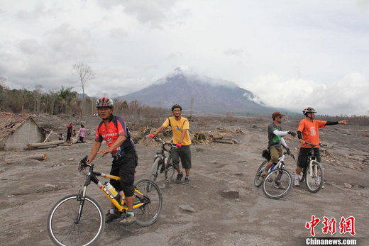 今年10月下旬,位于印尼日惹市的默拉皮火山在沉睡百年后,再次大規(guī)模數(shù)次噴發(fā),并造成300多人罹難、成千上萬人受傷,數(shù)十萬人撤離家園。默拉皮火山11月份停止噴發(fā)后,來自印尼各地的民眾紛紛來此旅游觀光。火山腳下一個(gè)叫GUNGAND被火山巖漿埋沒的村莊,每天來旅游的人數(shù)逾5000人。圖為當(dāng)?shù)氐淖孕熊噽酆谜咴谀せ鹕降貐^(qū)騎車游玩。中新社發(fā) 顧時(shí)宏 攝