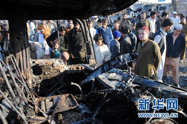2月8日,在巴基斯坦白沙瓦,當?shù)鼐用窬奂谝u擊現(xiàn)場。當日,巴武裝人員襲擊了北約部隊的油罐車。 新華社發(fā)(烏瑪爾·卡玉姆攝)