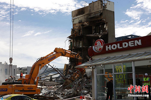 新西蘭大地震中最多失蹤者被埋的克萊斯特徹奇(又譯基督城)坎特伯雷電視大樓(CTV)已全面倒塌,附近的樓房也破壞嚴(yán)重。圖為電視大樓附近的樓房,正在清理倒塌的瓦礫。中新社發(fā) 蔡蔓莉 攝