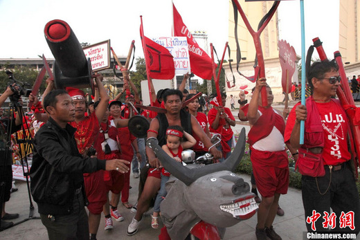 資料圖:當地時間2011年2月13日下午,泰國“紅衫軍”在首都曼谷舉行大規模集會示威活動,要求政府釋放仍羈押獄中的“紅衫軍”領導人。圖為當天傍晚時分,“紅衫軍”部分支持者高舉“土炮”模型、巨型彈弓繞民主紀念碑游行。中新社發 余顯倫 攝