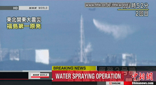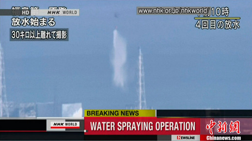 東京電力公司稱,直升機灑水前的當(dāng)?shù)貢r間17日上午9時40分,福島核電站核輻射量數(shù)值為3782微西弗,灑水后30分鐘,在離第三反應(yīng)堆數(shù)十米的同一地點進行了檢測,得到的數(shù)值為3754微西弗,放水前后的數(shù)值基本上沒有什么變化。