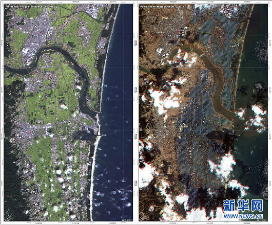 這是德國航空航天中心3月16日提供的日本部分地區(qū)海嘯前后對比衛(wèi)星圖片。兩張圖片分別拍攝于2010年9月5日(左)和2011年3月12日(右)。