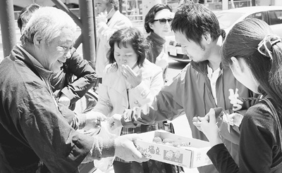 4月17日,來自日本福島縣矢祭町的一名農民(左)在東京街頭促銷農產品。新華社發