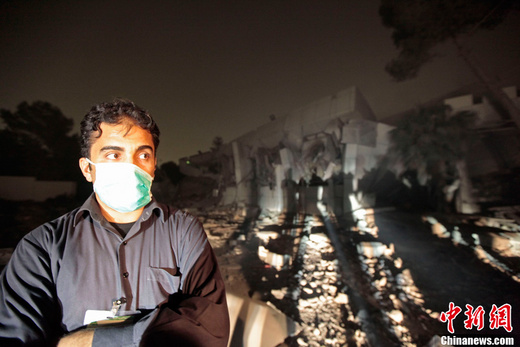 4月25日,在利比亞首都的黎波里,一名男子站在被轟炸的利比亞領導人卡扎菲的官邸前。北約戰機25日凌晨對利比亞領導人卡扎菲在的黎波里的官邸實施轟炸。利比亞政府官員譴責北約企圖殺害卡扎菲。