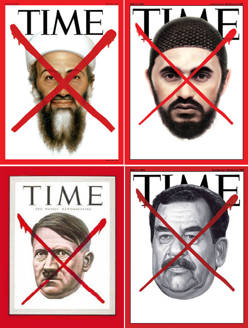 美國《時(shí)代》雜志在封面上給本·拉登、“911”恐怖襲擊主犯阿哈萊勒、希特勒、薩達(dá)姆(從左至右,從上至下)的頭像都畫上“紅叉叉”,寓意他們的死亡。