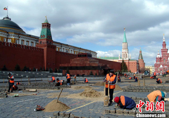 4月27日,俄羅斯首都莫斯科紅場。為迎接5月9日在此舉行的“勝利日”閱兵式,工人們正在加緊修繕紅場路面。中新社發(fā) 田冰 攝