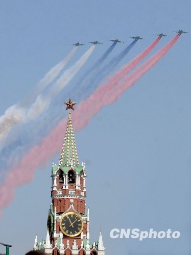 5月9日,俄羅斯在莫斯科紅場舉行規(guī)模空前的閱兵活動,紀念衛(wèi)國戰(zhàn)爭勝利65周年。6架蘇-25強擊機在紅場上空噴出象征俄羅斯國旗白、藍、紅三色的煙霧。