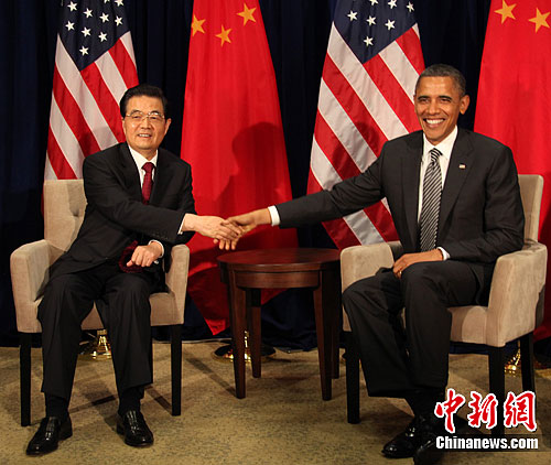 當地時間11月12日下午,中國國家主席胡錦濤在夏威夷州首府檀香山會見美國總統奧巴馬。中美兩國元首十天之內再次會晤。中新社發 張朔 攝