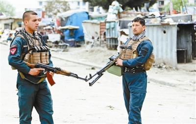 4月19日,阿富汗國家安全機構遭到塔利班武裝襲擊,圖為警察在爆炸襲擊現場警戒 供圖/新華社