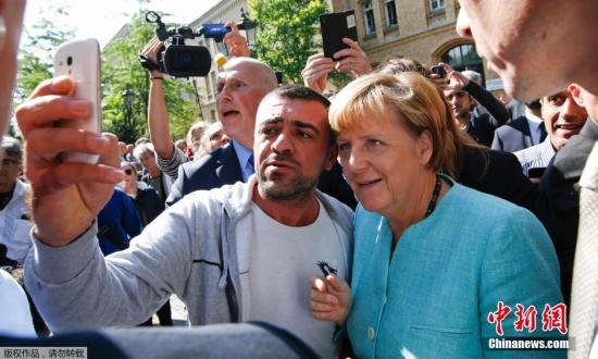 資料圖:柏林的一處難民營外,一位移民拿起手機與德國總理默克爾自拍合影。