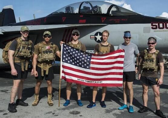 7月4日,美軍士兵等在航行于南海的“羅納德·里根”號航母甲板上舉著星條旗紀念美國獨立日。