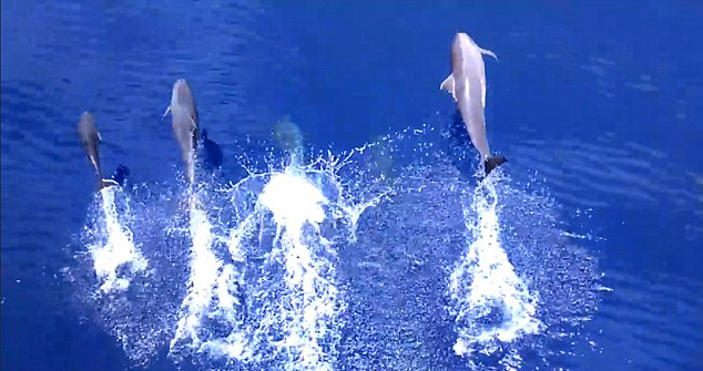 海豚是一種調(diào)皮的動物,游速很快。當(dāng)遇到快速行駛的船時,它們就喜歡跟在船邊游,然后超越到前面去跳水嬉戲。視頻中,一只會雜技表演的海豚甚至跳出水面,在空中翻跟頭。