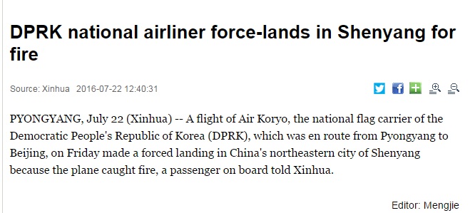 據新華社報道,朝鮮高麗航空一航班因為飛機起火,在沈陽迫降。該航班系從平壤飛往北京。