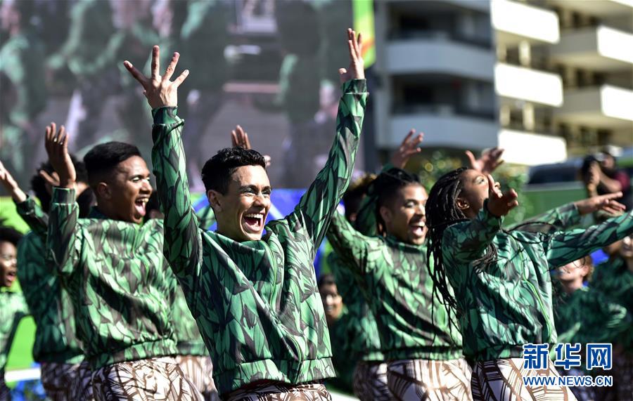 8月2日,舞蹈演員表演巴西特色舞蹈歡迎參加升旗儀式的各代表團。當日,51個體育代表團在2016年里約奧運會奧運村舉行升旗儀式,里約奧組委特地從巴西各地挑選了數十名舞者,為各國代表團現場表演融合了桑巴等多種巴西代表性舞姿的舞蹈,邀請各國運動員一起感受里約熱內盧的熱情。新華社記者岳月偉攝