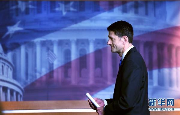 這是美國眾議院議長保羅·瑞安在美國華盛頓國會山出席記者會的資料照片(2016年5月12日攝)。 新華社記者殷博古攝