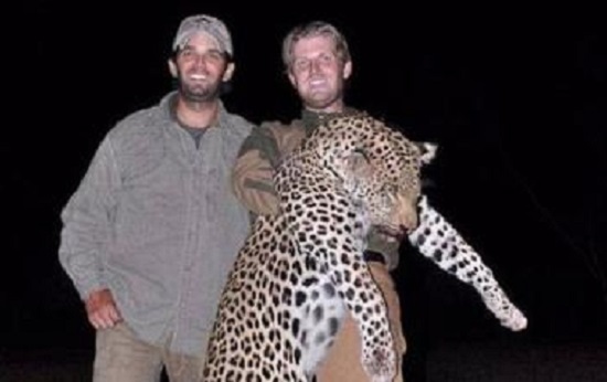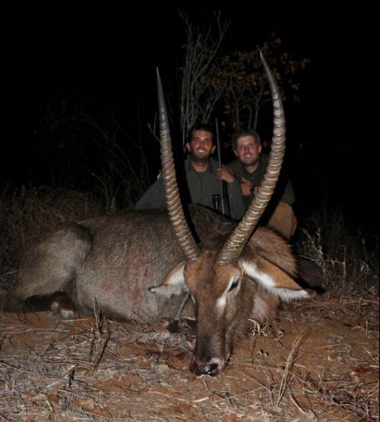 此前,我們經(jīng)常可以通過特朗普的兩個兒子(小唐納德Donald Jr.和埃里克Eric)在社交媒體上的照片看到他們打獵收獲的“戰(zhàn)利品”:其中有一張就是兩個人在非洲獵殺的豹子;另一張是小唐納德拿著一條他剛切下來的大象尾巴;還有則是兩個人微笑著站在美麗的水羚(waterbuck)角中間。