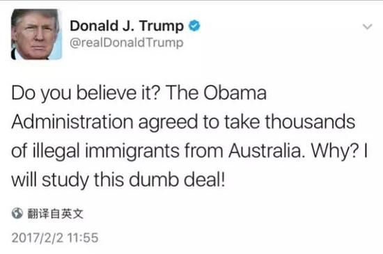 “你們能相信么?!奧巴馬政府居然同意把澳大利亞成千上萬的非法移民接到美國來!這是為什么?讓我好好研究研究這個傻X協議!”