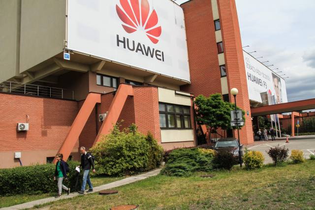 2016年6月14日,在波蘭首都華沙街頭,人們從中國華為公司的巨幅標(biāo)志前走過。(新華社記者陳序攝)