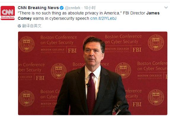 美國有線電視新聞網(wǎng)3月8日報道稱,科米8日出席由FBI與波士頓學(xué)院(Boston College)共同舉辦的首屆波士頓網(wǎng)絡(luò)安全會議。他在會中談到,自從2013年前國安局雇員斯諾登爆料國家安全機構(gòu)監(jiān)聽民眾之后導(dǎo)致各界關(guān)注的計算機加密問題。他認為美國人不應(yīng)該期待擁有絕對隱私,“在美國是沒有絕對隱私可言,也沒有逍遙法外之處。”