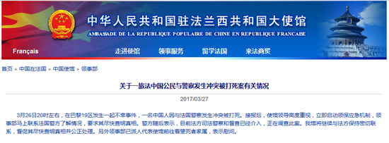 通報稱,3月26日20時左右,在巴黎19區發生一起不幸事件,一名中國人因與法國警察發生沖突被打死。接報后,使館領導高度重視,立即啟動領保應急機制,領事部馬上聯系法國警方了解情況,要求其盡快查明真相。