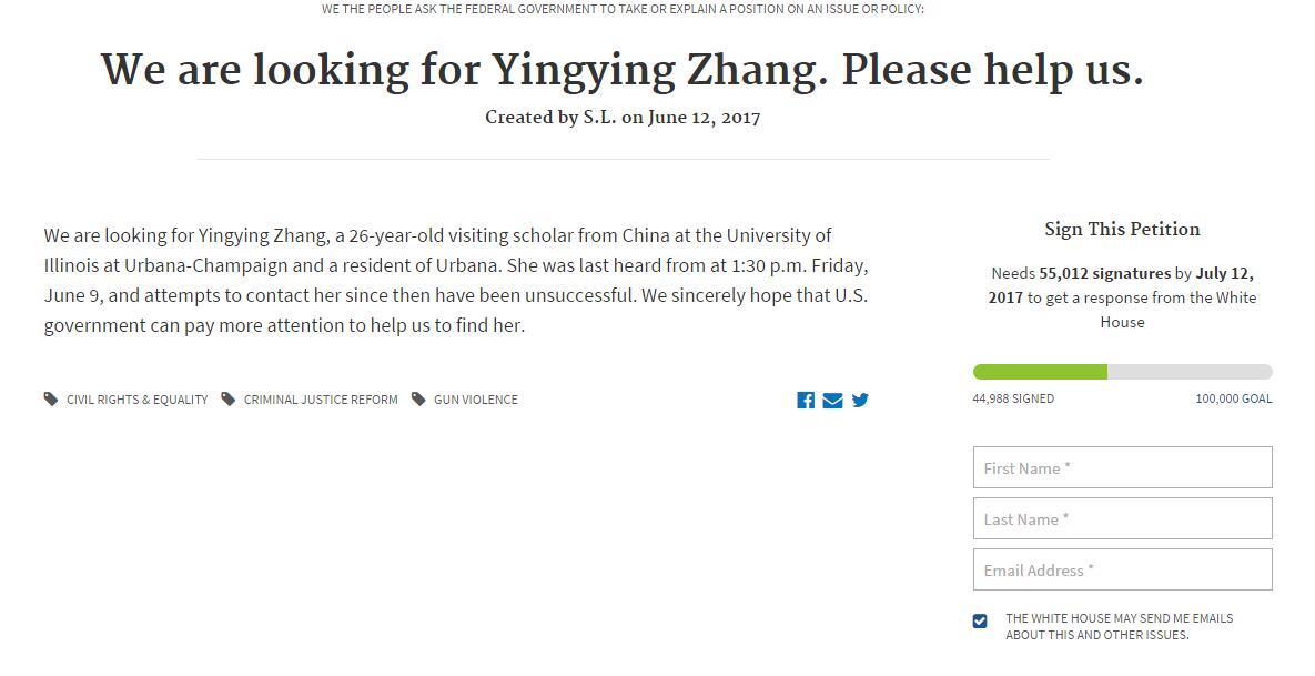 另據(jù)海外網(wǎng)早前報道,美國白宮網(wǎng)站上尋找章瑩穎的請愿已獲超過4萬人簽名。據(jù)“白宮請愿網(wǎng)”顯示,截至目前,尋找章瑩穎的請愿已經(jīng)獲得44988人簽名。