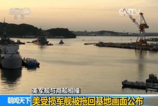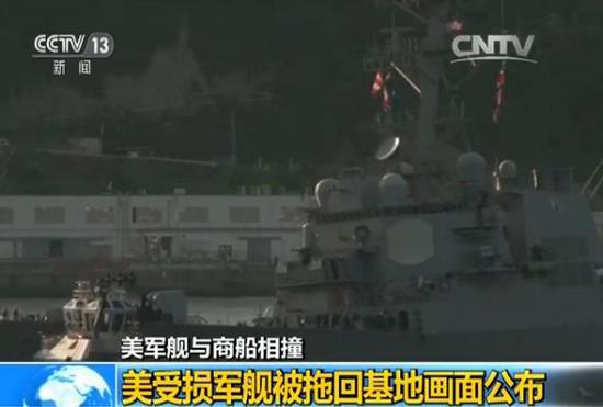 原標題:美軍艦與商船相撞:美受損軍艦被拖回基地畫面公布