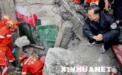 5月13日,溫家寶總理在四川都江堰市新建小學察看災情時,看見救援人員正在教學樓廢墟里搶救一名被困的小學生。溫家寶蹲坐在廢墟上對著孩子說,我是溫家寶爺爺,孩子們一定要挺住,一定會得救! 新華社記者姚大偉攝