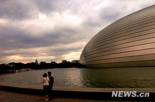 天安門廣場西面的國家大劇院就像一個擱淺在人工湖中的飛碟,這里白天對外開放參觀。盡管票價40元,參觀者的熱情仍舊很高。保羅·安德魯繼承了巴黎機(jī)場的設(shè)計原則:一個摩天外殼覆蓋著一座真正的“城市”。